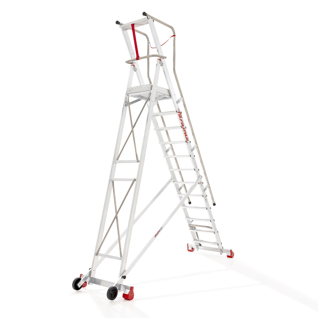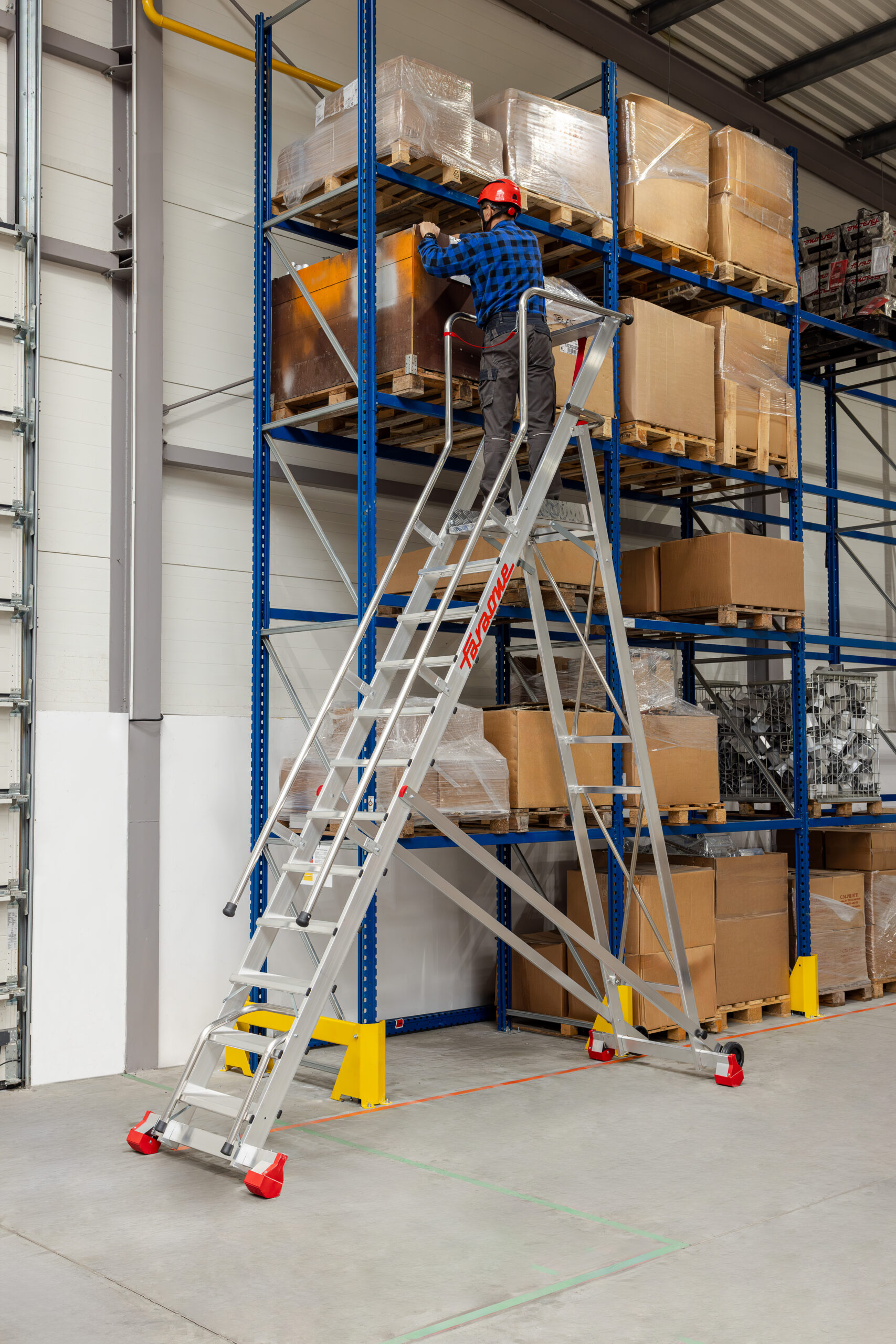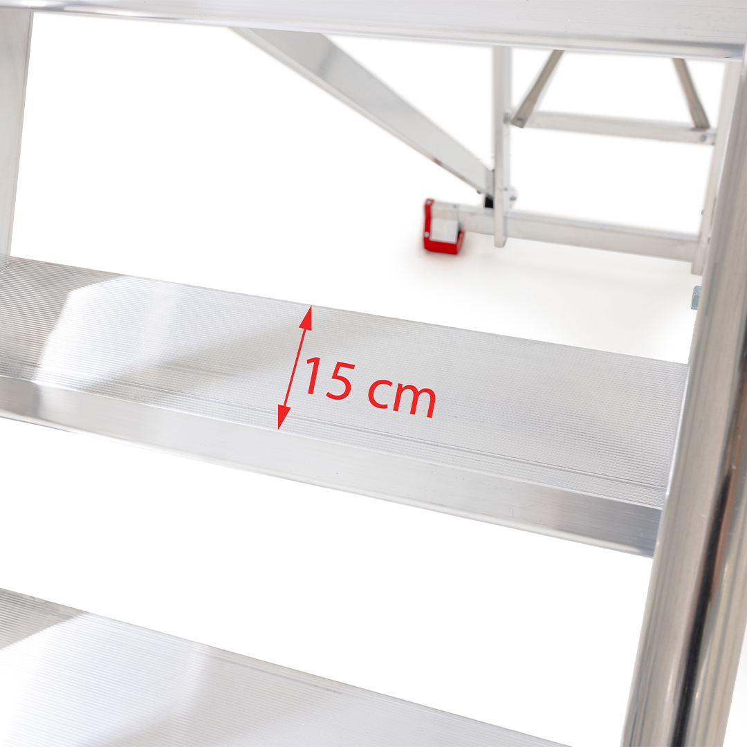 Podest wyposażony jest w antypoślizgowe stopnie, wygodne poręcze ochronne oraz platformę roboczą z barierkami, które zwiększają bezpieczeństwo operatora podczas pracy. Dzięki dwóm kołom jezdnym możliwe jest szybkie przestawianie podestu i jego stabilne unieruchomienie w miejscu pracy.