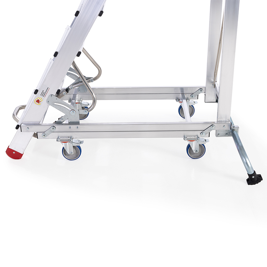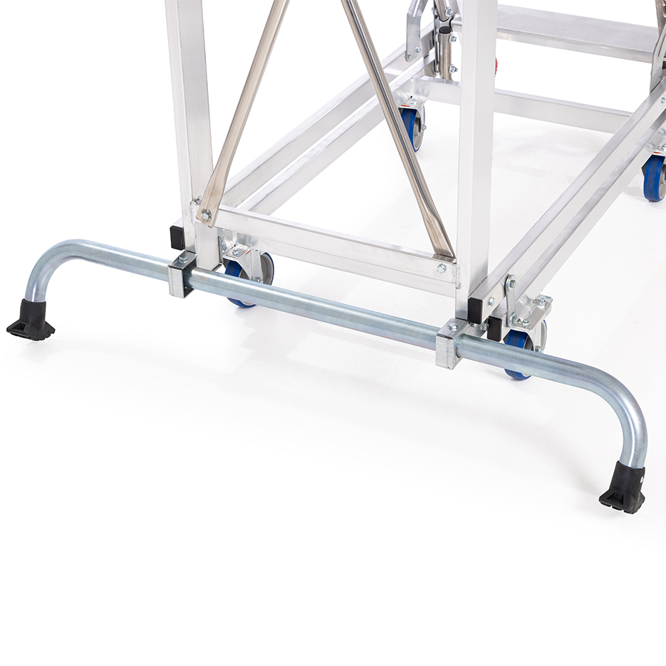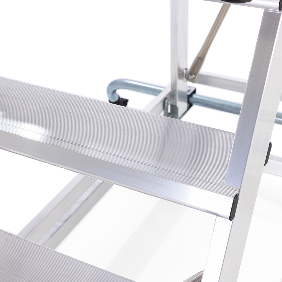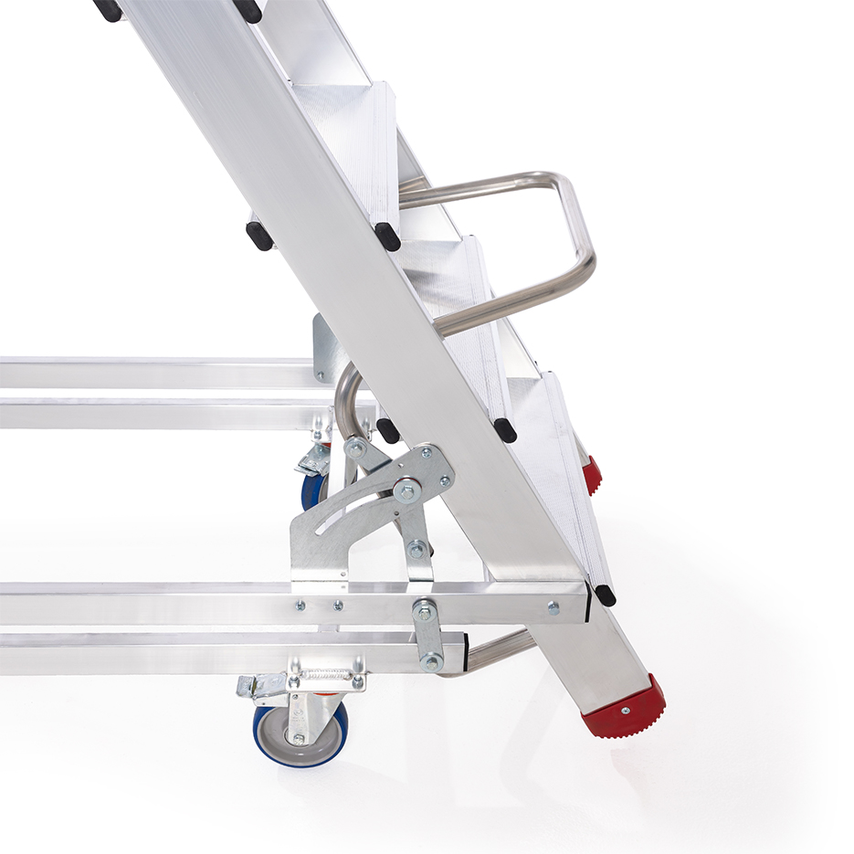 Drabina aluminiowa z barierkami i platformą roboczą. Stelaż drabiny stanowią kształtowniki o profilu zamkniętym. Podłużnice drabiny z przodu wykonane z wytrzymałych profili aluminiowych o przekroju 100 x 25 mm, ścianki dodatkowo pogrubione. Profil tylny o przekroju 80 x 25 mm. Wygodne przemieszczanie ułatwia wózek z automatyczną blokadą, zapewniający bezpieczne wejście na podest. Mechanizm zabezpieczenia opada automatycznie po wejściu na stopień.