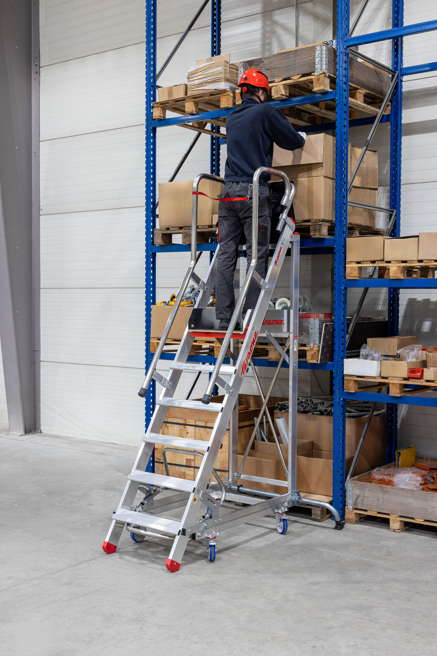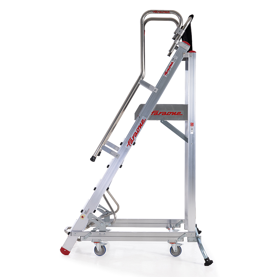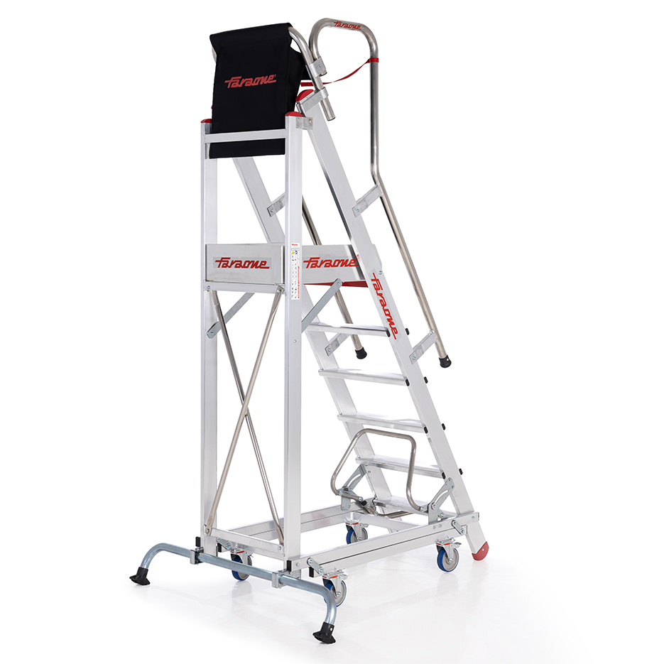 Drabina aluminiowa z barierkami i platformą roboczą. Stelaż drabiny stanowią kształtowniki o profilu zamkniętym. Podłużnice drabiny z przodu wykonane z wytrzymałych profili aluminiowych o przekroju 100 x 25 mm, ścianki dodatkowo pogrubione. Profil tylny o przekroju 80 x 25 mm. Wygodne przemieszczanie ułatwia wózek z automatyczną blokadą, zapewniający bezpieczne wejście na podest. Mechanizm zabezpieczenia opada automatycznie po wejściu na stopień.