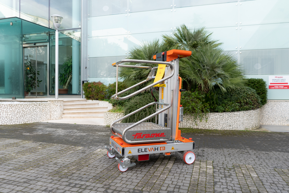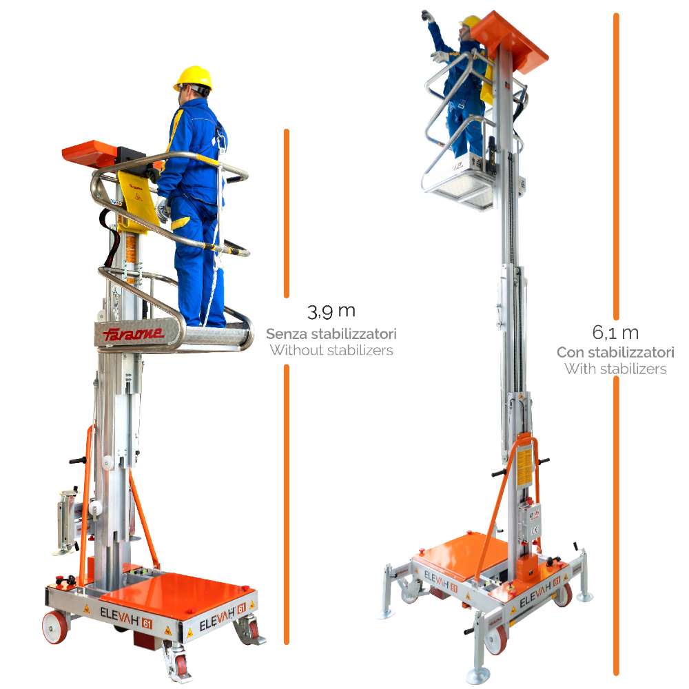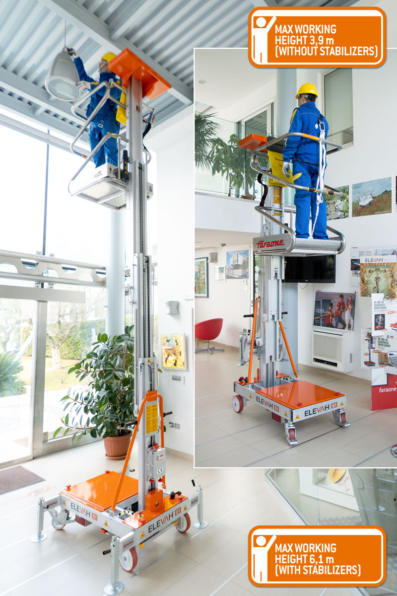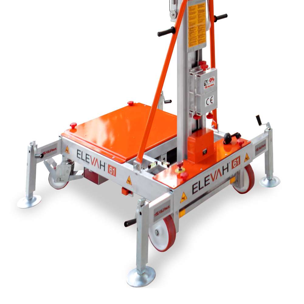 Podnośnik masztowy ELEVah 61 to kompaktowa i bezpieczna platforma robocza przeznaczona do prac na wysokości w magazynach, sklepach wielkopowierzchniowych, centrach logistycznych oraz obiektach przemysłowych. Urządzenie umożliwia pracę na wysokości roboczej do 6,1 m przy zastosowaniu stabilizatorów oraz do 3,9 m bez ich użycia.