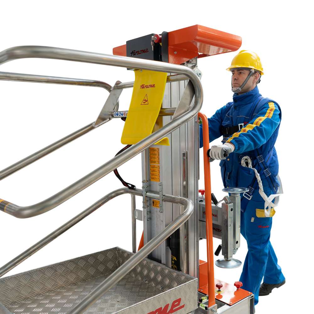 Stabilna platforma z barierkami ochronnymi zapewnia bezpieczeństwo operatora, a intuicyjny system podnoszenia umożliwia wygodną obsługę z poziomu kosza. Antypoślizgowa podłoga oraz solidna, przemysłowa konstrukcja gwarantują komfort i trwałość użytkowania.