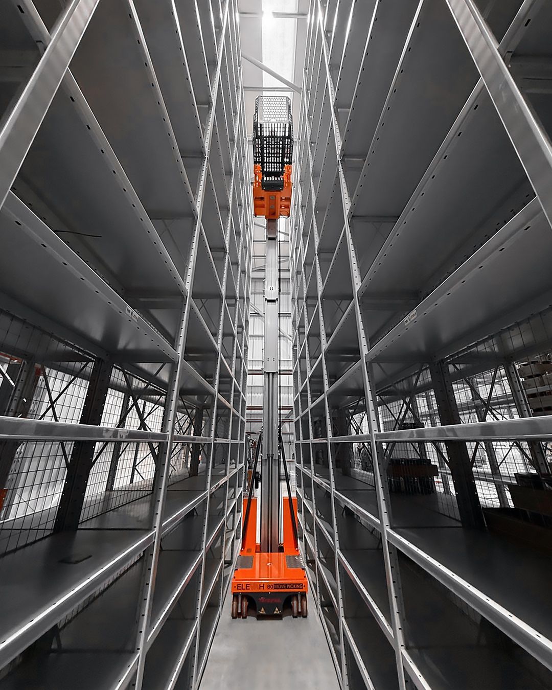 Duża wysokość robocza – do 7,78 m pozwala sięgać wyższe poziomy regałów bez drabin.