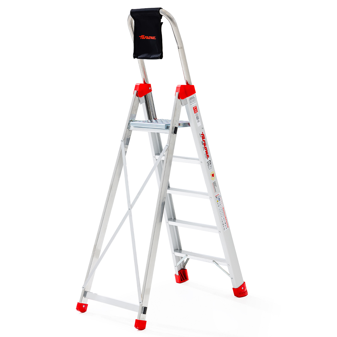 Profesjonalne drabiny aluminiowe, które dzięki zastosowaniu specjalnych profili, posiadają zwiększoną sztywność. Stopnie z profilami antypoślizgowymi. Lotniczy styl mocowania stopni bez spawania. Rowkowane zaślepki z tworzywa zabezpieczają końce drabiny przed poślizgiem i nie niszczą podłogi. Drabiny posiadają europejski certyfikat EN 131. Drabina wyposażona jest w wygodną torbę na narzędzia. Wysokość poręczy 63 cm.