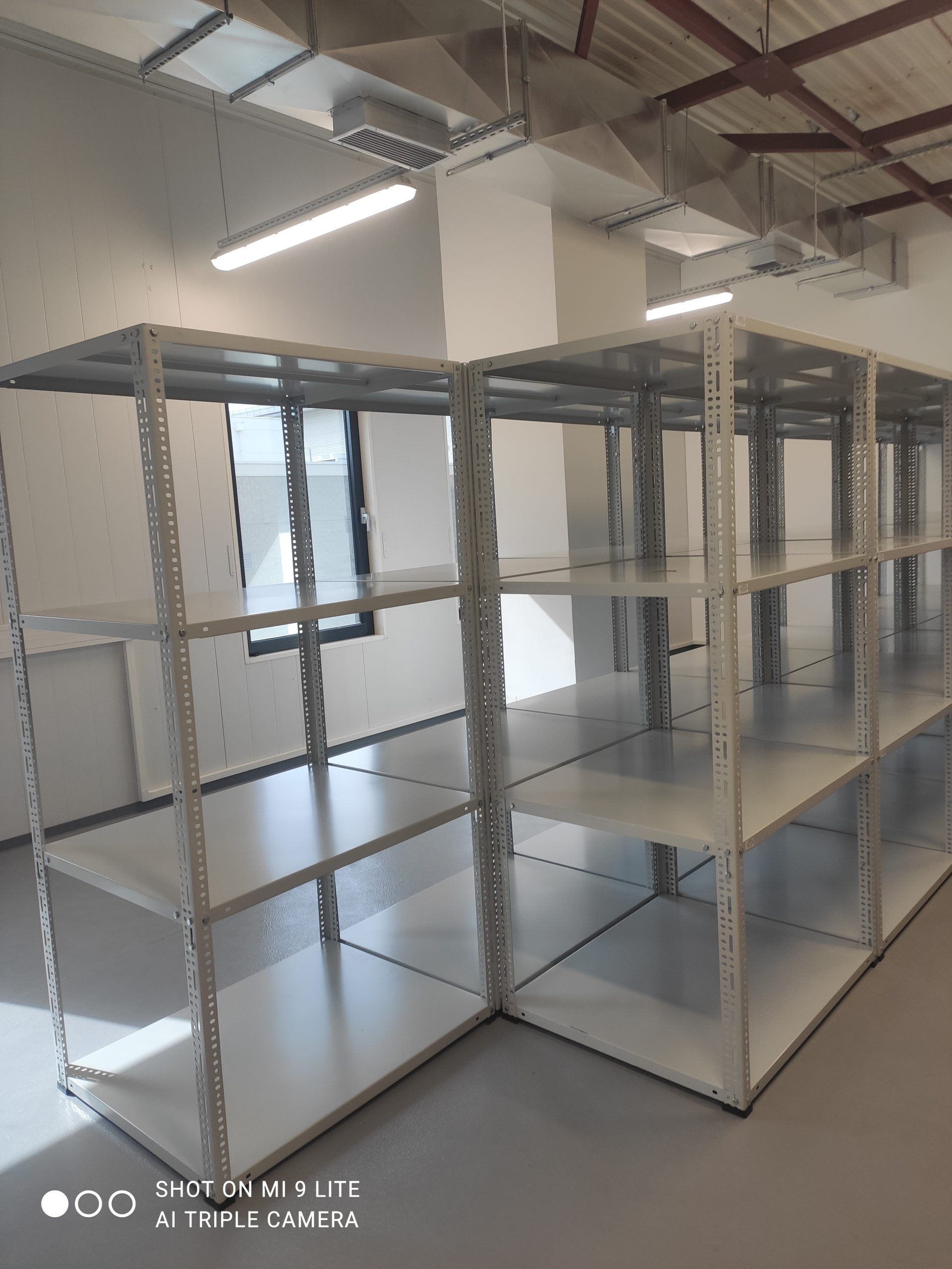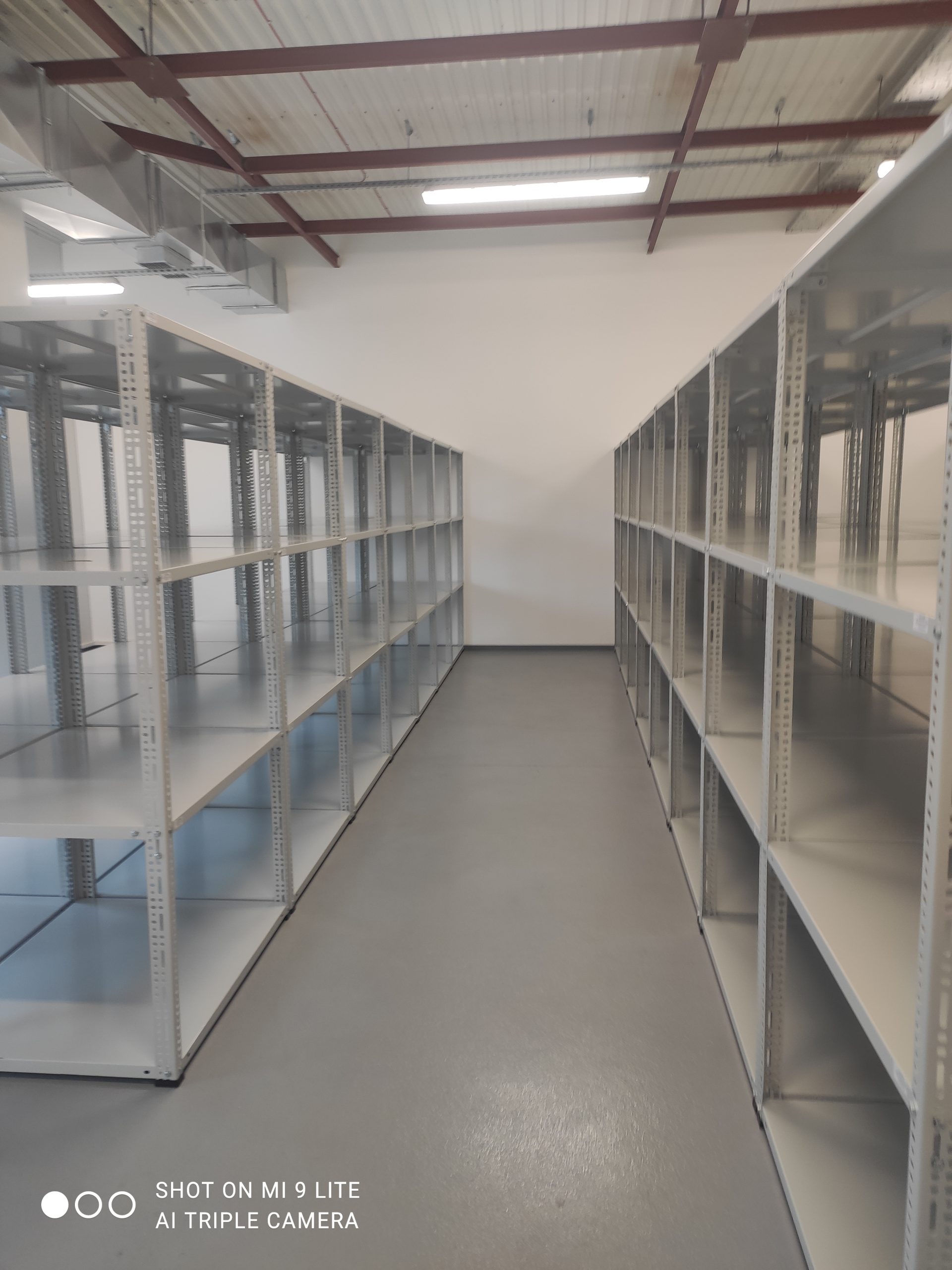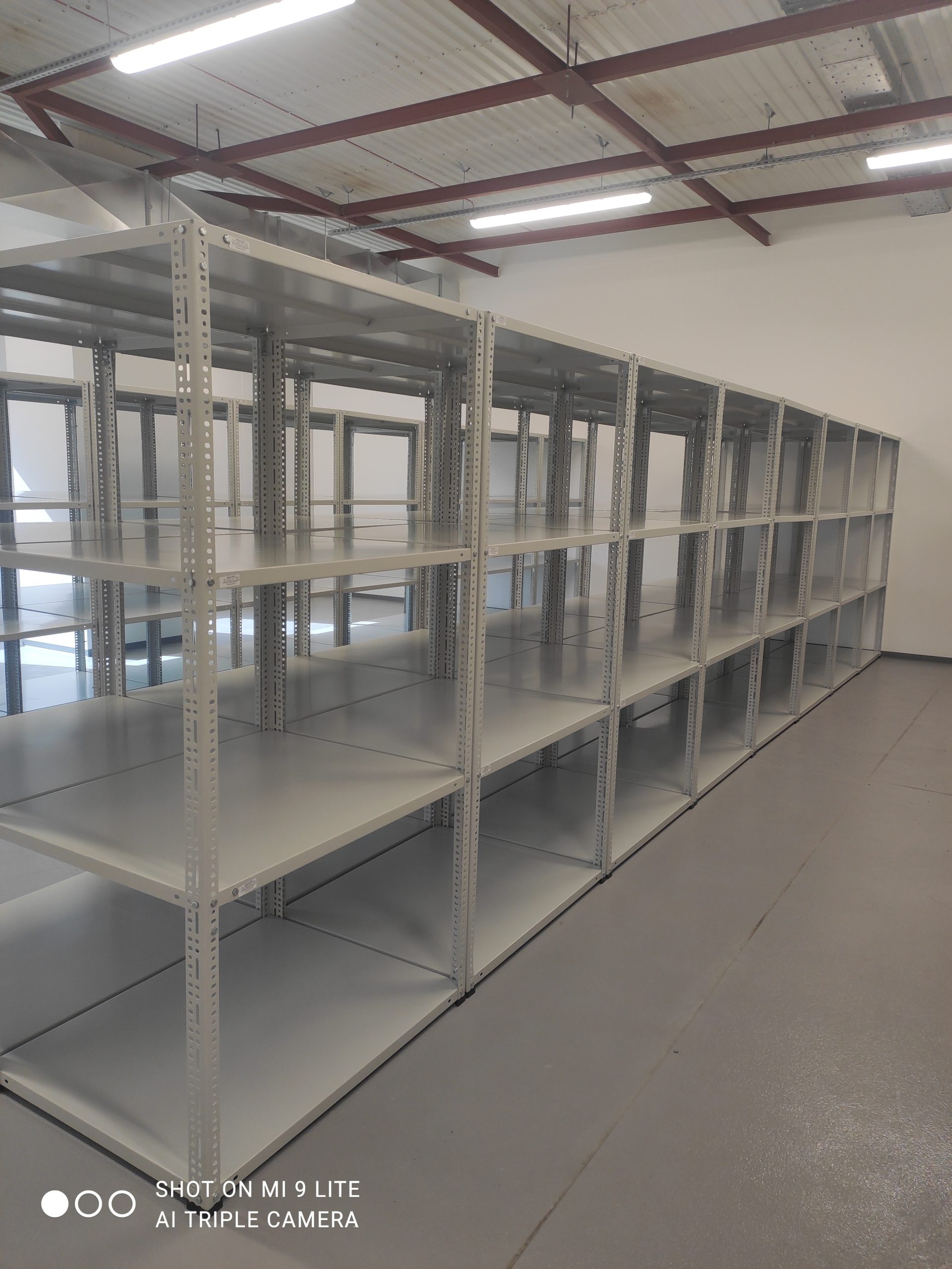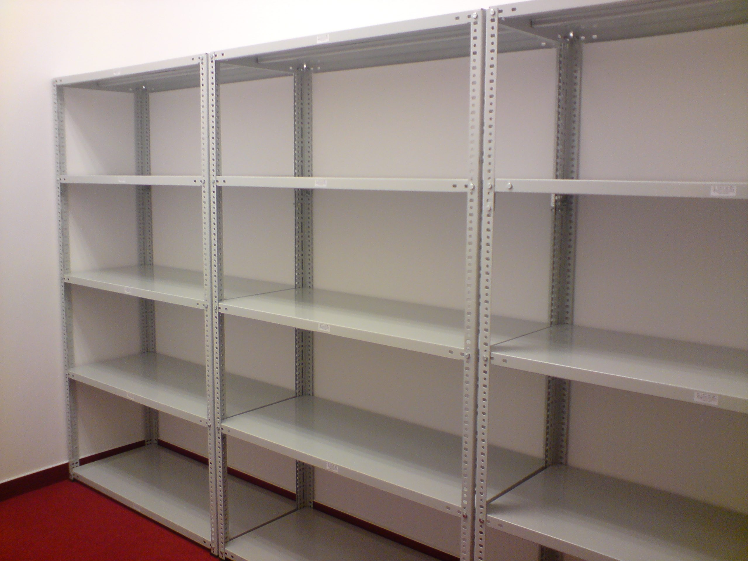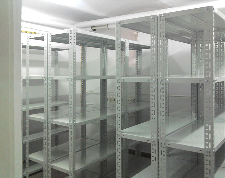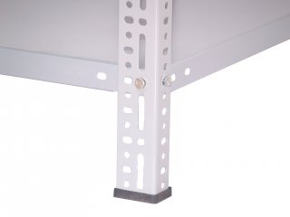 Regały metalowe SMJC mają standardową szerokość półek to 900 mm, ale możemy wykonać półki o dowolnych wymiarach do szerokości 1180 mm. Półki wykonane są z blachy stalowej o grubości 1 mm podwójnie doginanej, wzmacnianej od spodu profilem V o udźwigu na półkę do 150 kg. Możemy wykonać półki z podwójnym lub potrójnym wzmocnieniem, by uzyskać udźwig do 200 kg. Zagięcie półki 35 mm. Słupy nośne wykonane są z kątownika 35×55×2 mm perforowanego co 20 mm i wyposażone w stopkę z tworzywa. Montaż śrubowy na śruby M8. Regały półkowe posiadają dodatkowo kątowniki wzmacniające, montowane pod najniższą i najwyższą półkę, usztywniające całą konstrukcję. Regały są lakierowane proszkowo standardowo na kolor szary RAL 7035. W pomieszczeniach z tryskaczami możemy zaoferować metalowe półki perforowane, które umożliwiają spływ wody. Udźwig całego regału 850 kg.