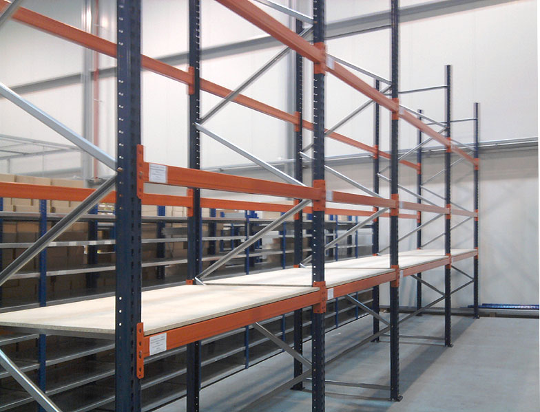 Regały paletowe można wyposażyć w półki z płyty wiórowej o grubości 18 lub 22 mm. Takie wypełnienie półek umożliwia składowanie drobnych elementów i nie przeszkadza to w składowaniu palet. Płyty można zainstalować na bezpośrednio na trawersach a dodatkowo zabezpieczyć od dołu wspornikami a na krawędziach ogranicznikami, które będą zapobiegać zsuwaniu się płyty. Drugim sposobem montażu jest ułożenie płyt na specjalnych wspornikach. Płyty spoczywają na nich i są zlicowane z trawersami. Udźwig półki zależy od ilości zastosowanych wsporników.