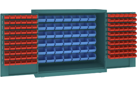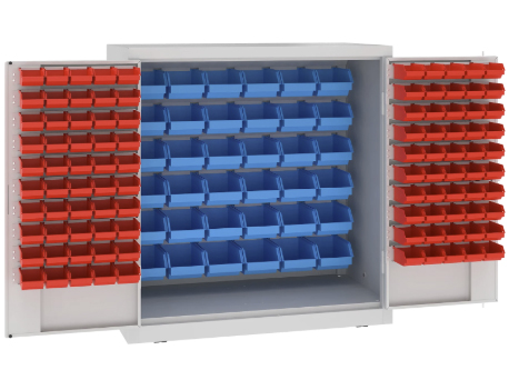 Korpus oraz drzwi wykonane są z wytrzymałej blachy stalowej o grubości 1,0 mm, co gwarantuje wysoką odporność na uszkodzenia mechaniczne i długą żywotność. Wnętrze szafy zostało wyposażone w system listew montażowych z pojemnikami warsztatowymi, umożliwiający czytelne i ergonomiczne rozmieszczenie drobnych elementów.