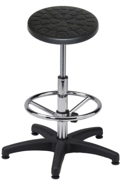 Wytrzymałość i łatwa higiena: Profilowane, antypoślizgowe siedzisko z poliuretanu wyróżnia się wysoką odpornością na uszkodzenia mechaniczne, działanie chemikaliów oraz promieniowanie UV. Nie absorbuje wody ani tłuszczów, co ułatwia utrzymanie czystości i zapewnia odporność na środki dezynfekujące — cecha niezwykle istotna w laboratoriach, placówkach medycznych i zakładach produkcyjnych.