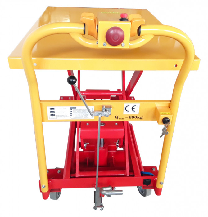Wózek wyposażony jest w hydraulicznie unoszoną platrormę i elektryczny napęd jazdy. Podnoszenie platformy odbywa się za pomocą pompy nożnej. Płynność opuszczania zapewnia specjalny zawór sterowany dźwignią ręczną.