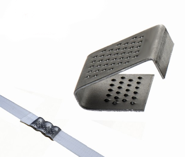 • metalowe zapinki blaszane perforowane – idealne do taśm stalowych, gwarantują bardzo mocny zacisk i pewne unieruchomienie ciężkich ładunków,